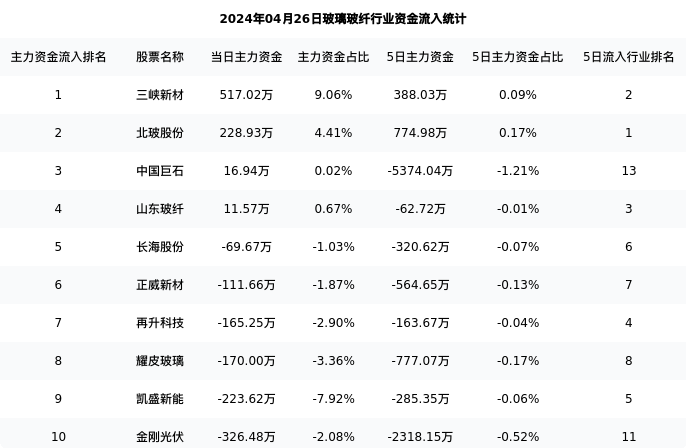 从主力资金流向来看,玻璃玻纤行业今日主力资金流入7.84亿元,在所有申万二级行业中排名:100/131。
