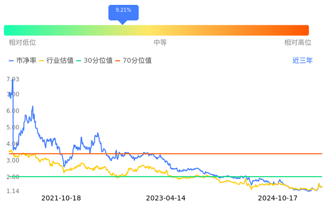 凯盛新能当前市净率PB为1.36,在所属的玻璃玻纤中,市净率PB排8,前五名分别为长海股份市净率1.01、中材科技市净率1.08、山东玻纤市净率1.11、旗滨集团市净率1.19、南玻A市净率1.22。凯盛新能当前市净率PB为1.36,超过近3年9.21%的历史数据。