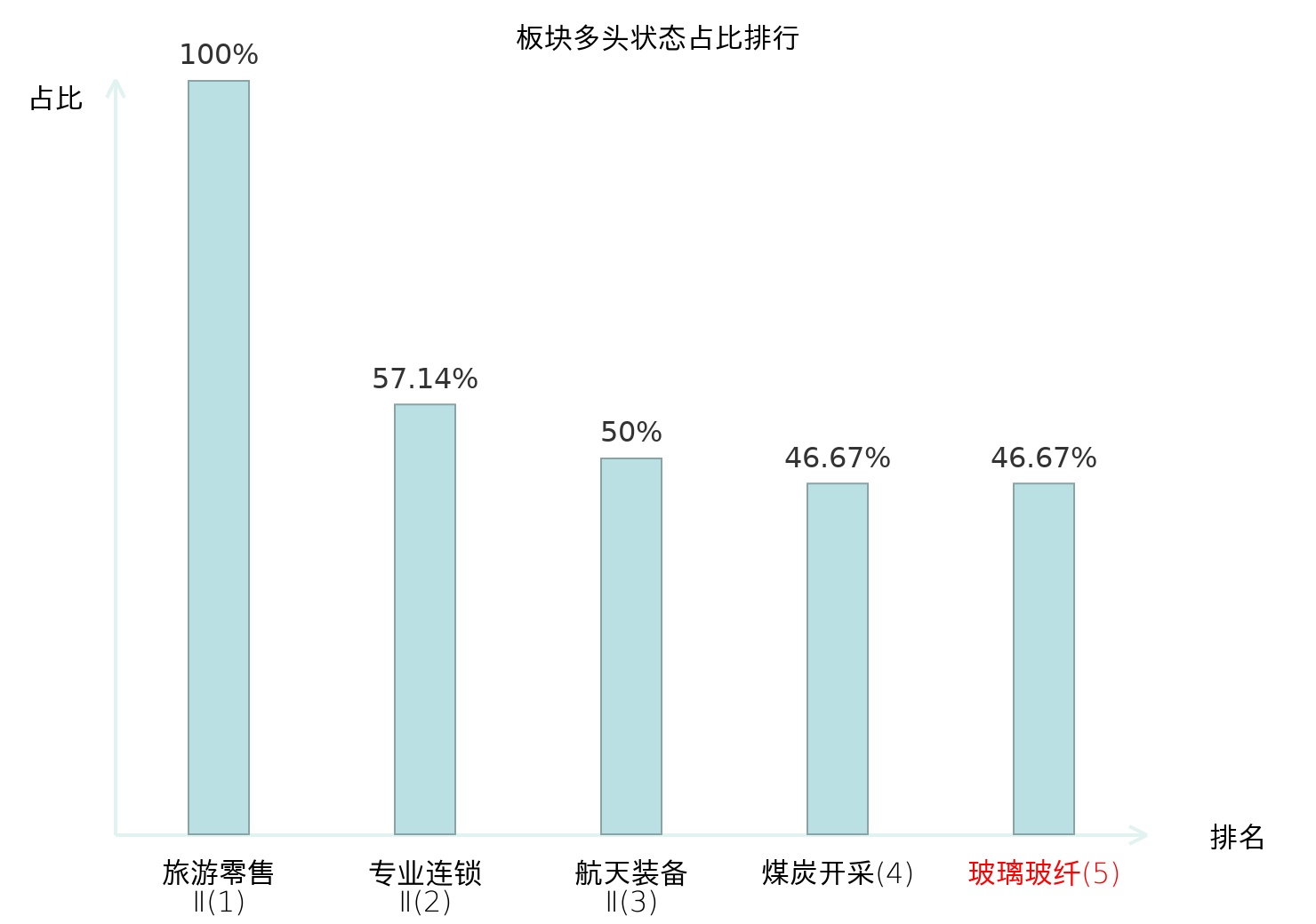 全市场所有行业板块中主力多头状态占比排名中,旅游零售Ⅱ板块位居第一。普钢板块名次提升最快,较昨日上升64位。