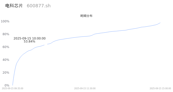 600877电科芯片2025年09月15日成交34.43万手,成交金额5.05亿,相较昨日放量9.18万手,换手率2.91%,成交清淡。