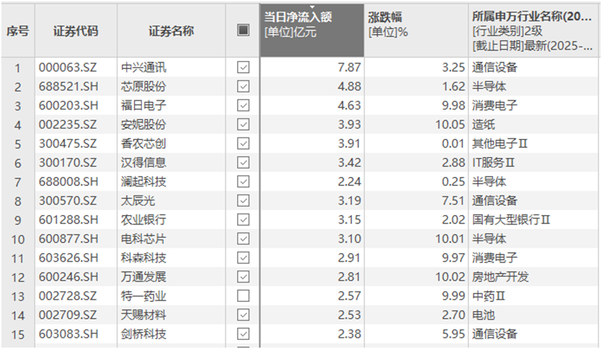 上证报中国证券网讯Choice数据显示,11月27日,当日资金净流入额排名前个股包括中兴通讯、芯原股份、福日电子、安妮股份、香农芯创、汉得信息、太辰光、农业银行、电科芯片等,净流入额均超3亿元。其中,芯原股份、福日电子、电科芯片等属于半导体或消费电子板块。