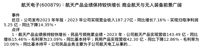 值得注意的是:2024年04月中邮证券的鲍学博/王煜童分析师,首次发布关于航天电子的研究报告,标题为:航天电子(600879):航天产品业绩保持较快增长 商业航天与无人装备前景广阔。