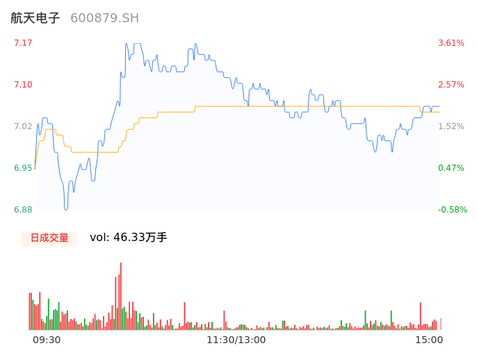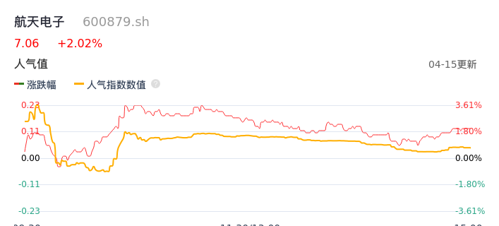 04月15日,航天电子收报7.06,股价涨幅2.02%,成交金额3.27亿元,换手率1.43%。