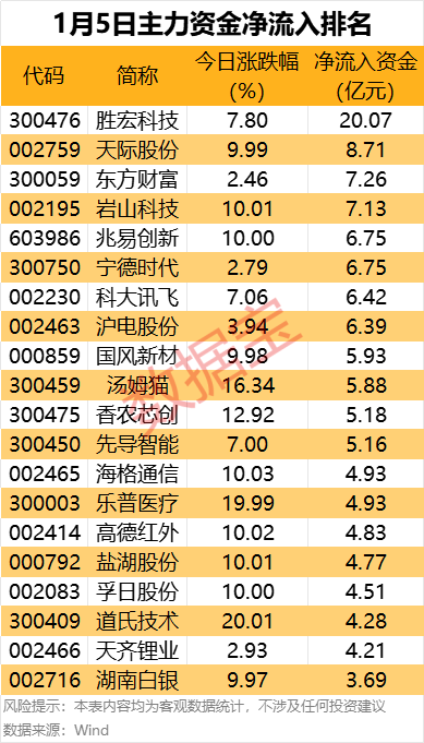 胜宏科技主力资金净流入20.07亿元,远超其他个股。午后PCB概念股异动拉升,消息面上,国金证券研报称,2026年英伟达Rubin部分PCB开始采用M9材料,正在推进的正交背板对M9材料需求较大,谷歌TPU产品也有望采用M9材料,其他ASIC厂商也有望采用M9,未来三年M9材料需求爆发式增长。