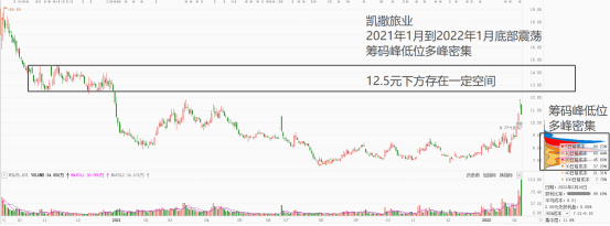 2021年1月到2022年1月,受到疫情影响凯撒旅业出现了长期一年的筑底横盘完成底部低位筹码多峰密集,在疫情特效药以及旅游复苏预期等多个利好刺激下出现了一波快速的连续上涨,并在阻力区受阻完成超跌反弹阶段行情。