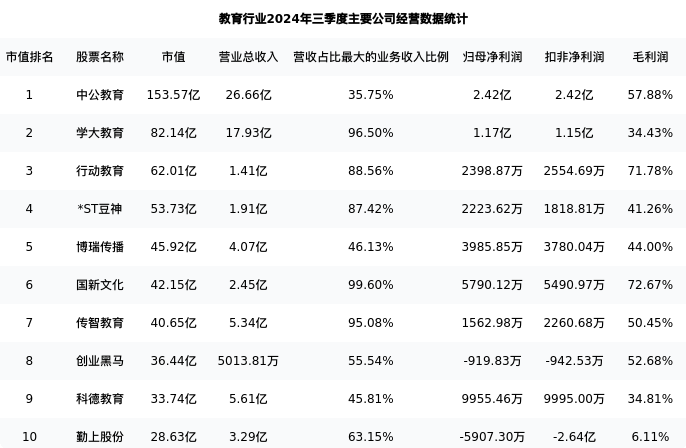 博瑞传播最新报告期数据为三季度,下表汇总了教育行业内市值靠前的公司三季度主要经营数据