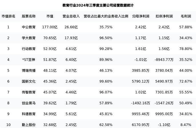 博瑞传播最新报告期数据为三季度,下表汇总了教育行业内市值靠前的公司三季度主要经营数据