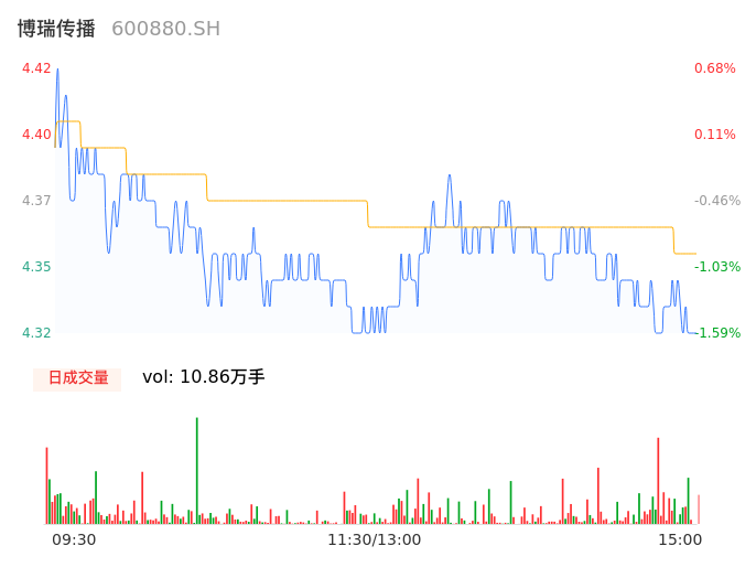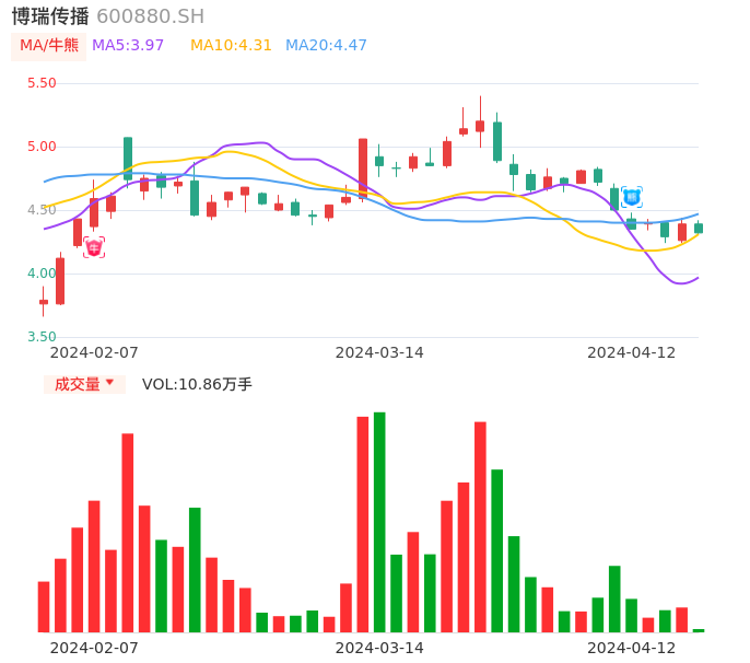 04月12日,博瑞传播收报4.32,股价涨幅-1.59%,成交金额4729.42万元,换手率0.99%。