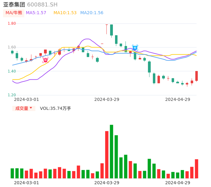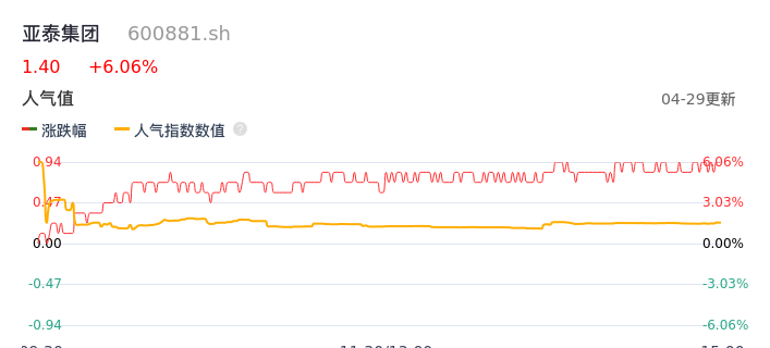 04月29日,亚泰集团收报1.40,股价涨幅6.06%,成交金额4896.06万元,换手率1.10%。