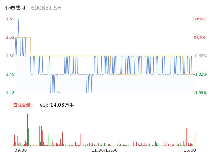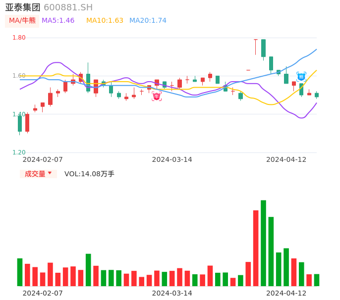 04月12日,亚泰集团收报1.49,股价涨幅-1.32%,成交金额2103.71万元,换手率0.43%。