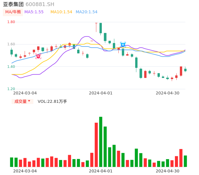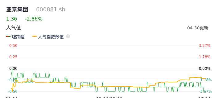 04月30日,亚泰集团收报1.36,股价涨幅-2.86%,成交金额3125.66万元,换手率0.70%。