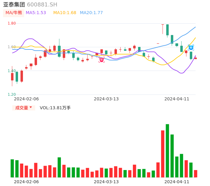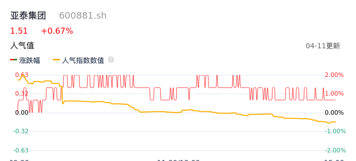 04月11日,亚泰集团收报1.51,股价涨幅0.67%,成交金额2093.54万元,换手率0.43%。
