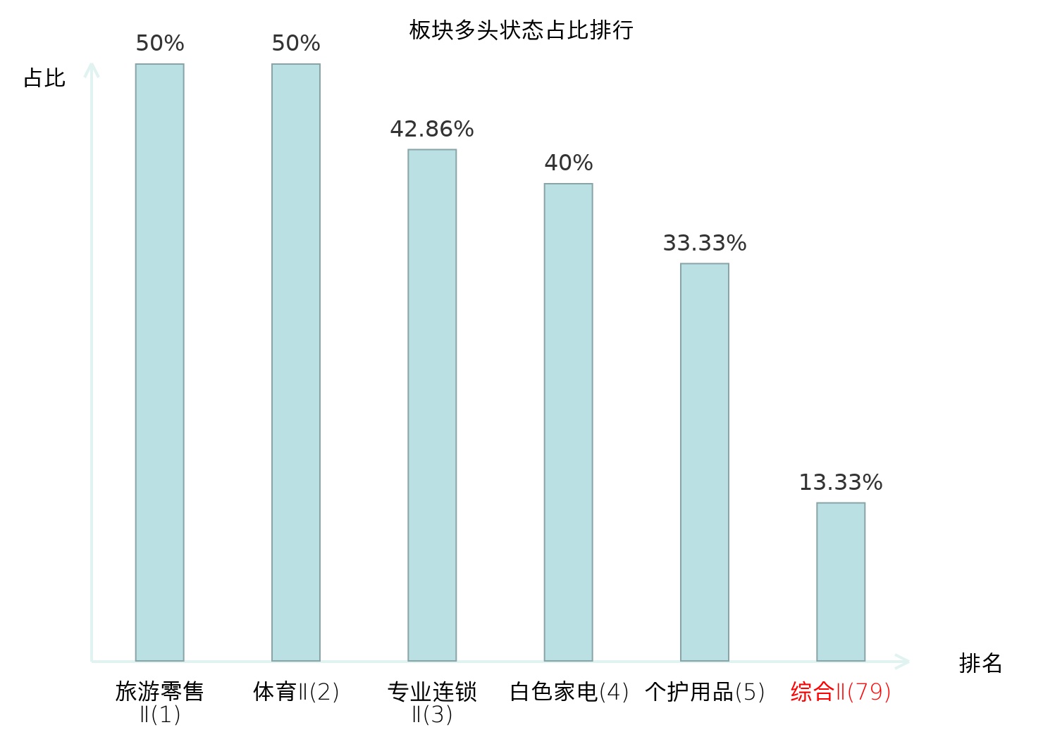 全市场所有行业板块中主力多头状态占比排名中,旅游零售Ⅱ板块位居第一。化学原料板块名次提升最快,较昨日上升35位。