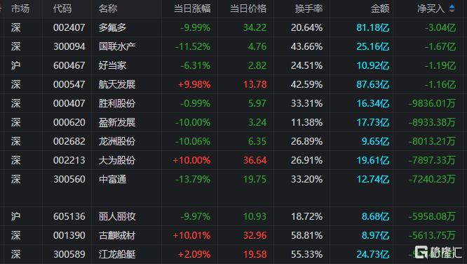 国联水产:今日下跌11.52%,全天换手率43.66%,成交额25.16亿元。营业部席位合计净卖出1.67亿元。