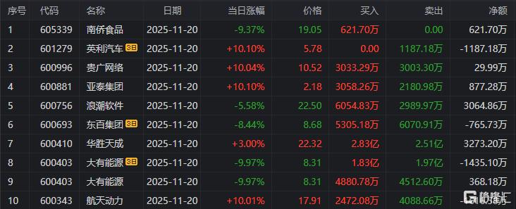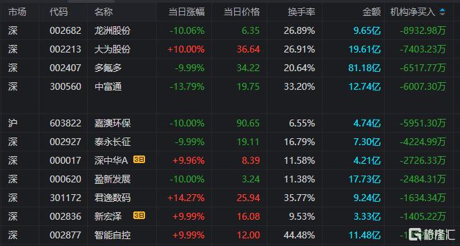 龙虎榜中涉及机构专用席位的个股中,当日净卖出额前三为龙洲股份、大为股份、多氟多,分别为8932.98万元、7403.23万元、6517.77万元。