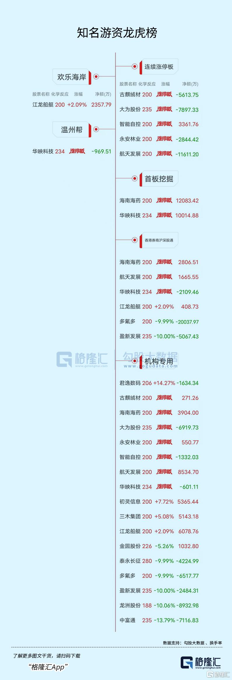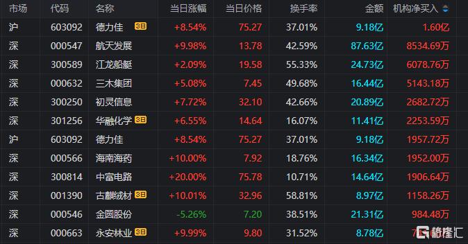 龙虎榜中涉及机构专用席位的个股中,当日净买入额前三为航天发展、江龙船艇、三木集团,分别为8534.69万元、6078.76万元、5143.18万元。