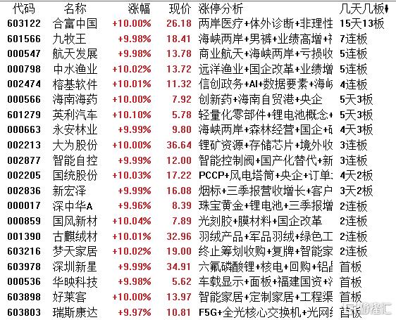 高位股方面,合富中国复牌后再度涨停走出15天13板,九牧王上演“天地天”晋级7连板,航天发展、中水渔业5连板,榕基软件4连板。