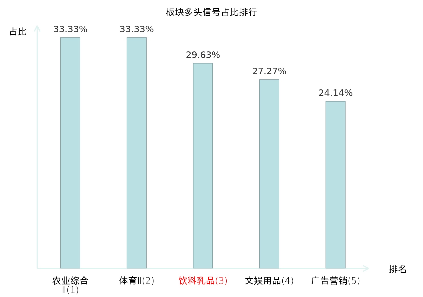 全市场所有行业板块中主力多头信号占比排名中,农业综合Ⅱ板块位居第一。体育Ⅱ板块名次提升最快,较昨日上升128位。