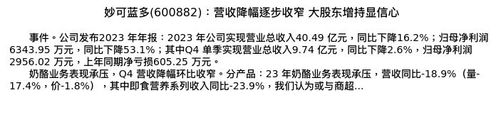 值得注意的是:2024年04月海通证券的颜慧菁/程碧升/张宇轩分析师,首次发布关于妙可蓝多的研究报告,标题为:妙可蓝多(600882):营收降幅逐步收窄 大股东增持显信心。