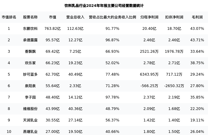 妙可蓝多最新报告期数据为年报,下表汇总了饮料乳品行业内市值靠前的公司年报主要经营数据