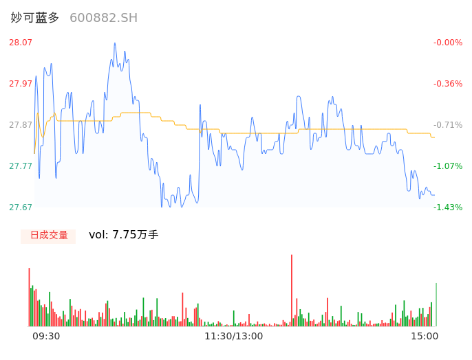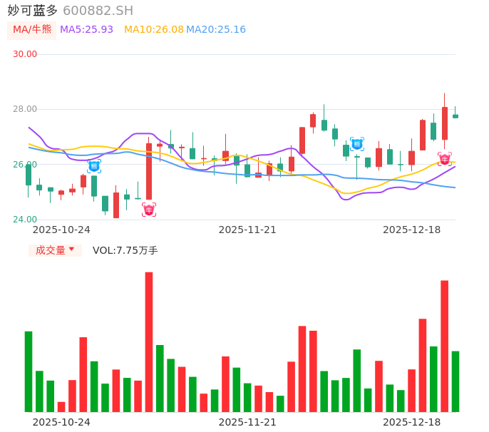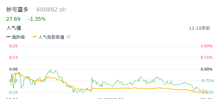 12月18日,妙可蓝多收报27.69,股价涨幅-1.35%,成交金额2.16亿,换手率1.52%。