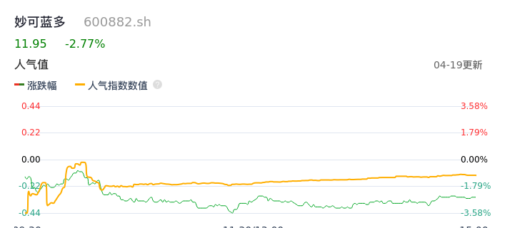 04月19日,妙可蓝多收报11.95,股价涨幅-2.77%,成交金额5039.88万元,换手率0.82%。