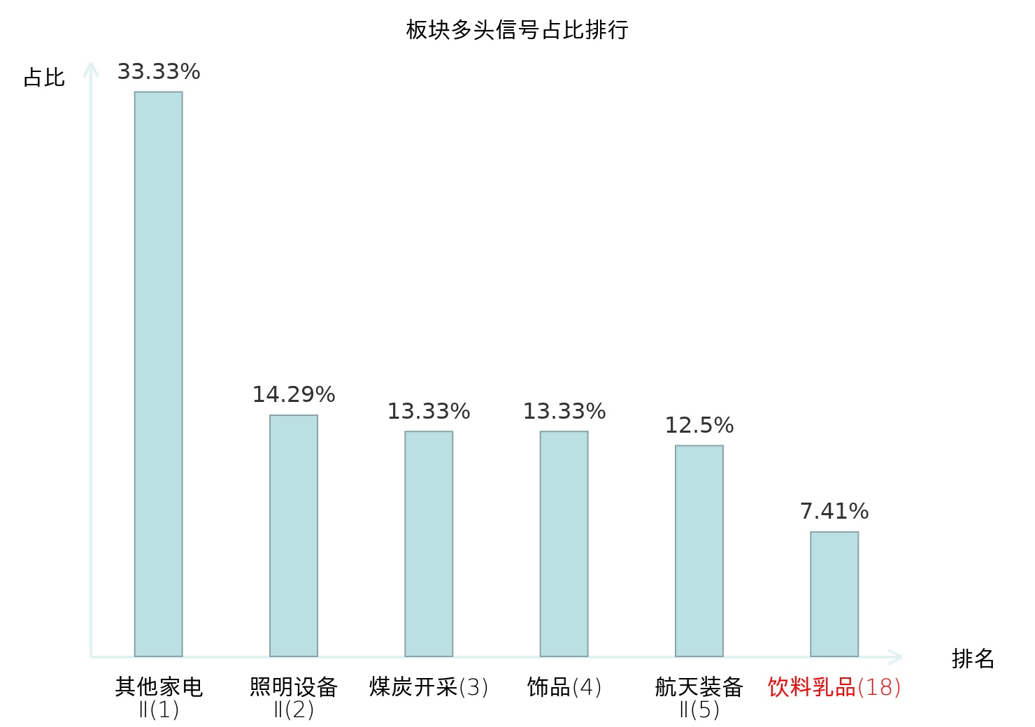 全市场所有行业板块中主力多头信号占比排名中,其他家电Ⅱ板块位居第一。其他家电Ⅱ板块名次提升最快,较昨日上升128位。