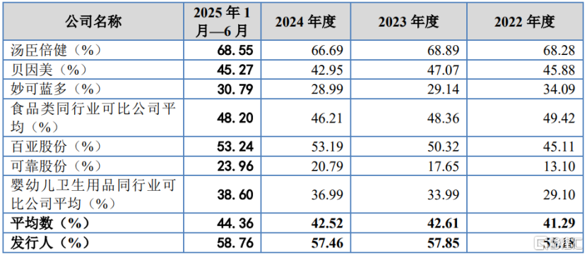 报告期各期,英氏控股的综合毛利率分别为55.18%、57.85%、57.46%和58.76%。其中,公司婴幼儿辅食的毛利率在61%左右,高于贝因美和妙可蓝多,低于汤臣倍健;婴幼儿卫生用品毛利率从28.12%增长至43.77%,低于百亚股份,高于可靠股份。