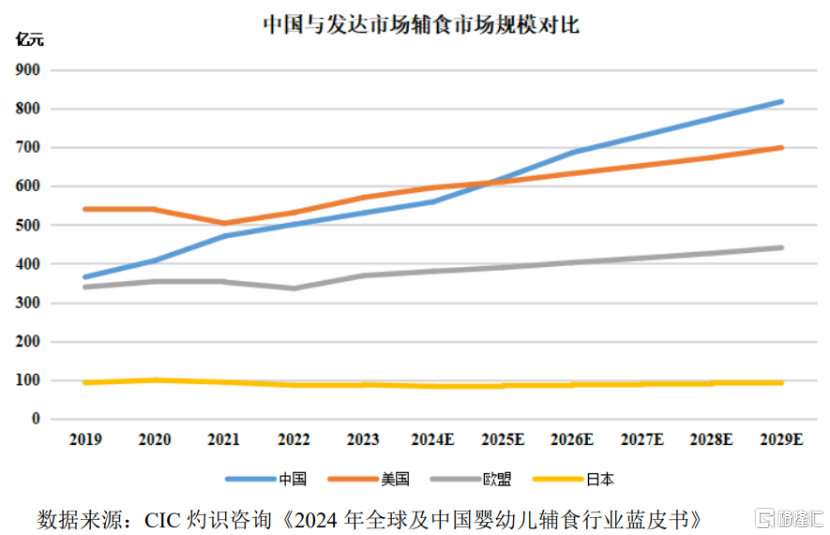 2024年美国、欧盟、日本的婴幼儿辅食渗透率已高达81%、77%和71%,非洲等欠发达地区渗透率相对较低,2024年全球婴幼儿辅食整体渗透率约为20%,预计2029年能够达到25.3%。