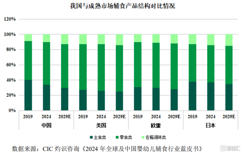 我国消费者喂养方式向高端化、精细化、多品类方向转变,消费习惯向成熟市场靠拢。2024年中国婴幼儿辅食渗透率为38%,相对发达市场仍有较大上升空间,预计到2029年渗透率将提升至51%。
