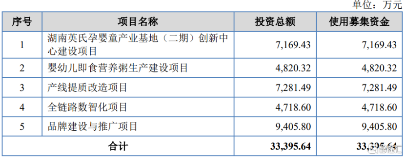本次IPO,公司拟募集资金约3.34亿元,用于湖南英氏孕婴童产业基地(二期)创新中心建设项目、婴幼儿即食营养粥生产建设项目、产线提质改造项目、全链路数智化项目、品牌建设与推广项目。