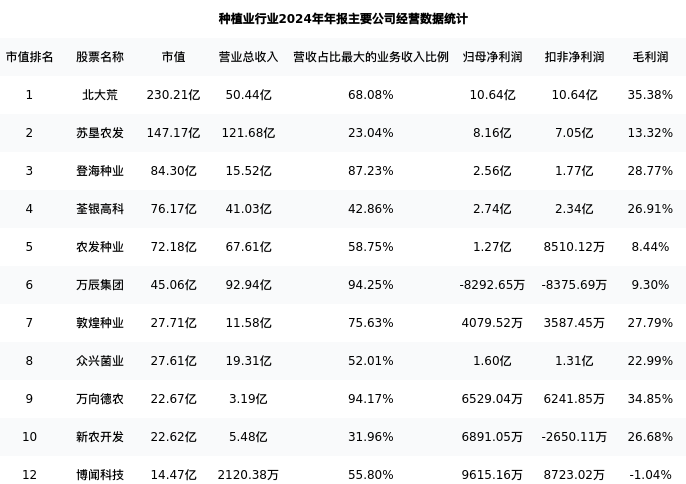 博闻科技最新报告期数据为年报,下表汇总了种植业行业内市值靠前的公司年报主要经营数据