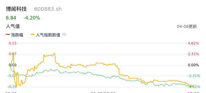 04月08日,博闻科技收报6.84,股价涨幅-4.20%,成交金额2727.73万元,换手率1.66%。