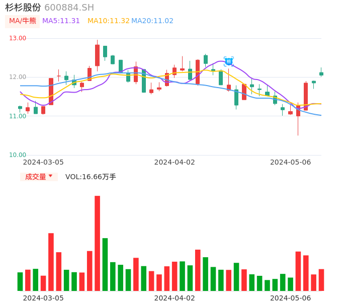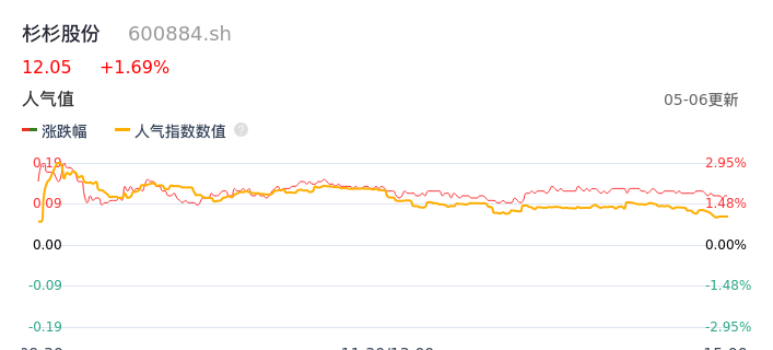05月06日,杉杉股份收报12.05,股价涨幅1.69%,成交金额2.02亿元,换手率0.95%。