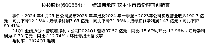 值得注意的是:2024年04月民生证券的邓永康/李孝鹏/王一如/朱碧野/李佳/赵丹/席子屹/黎静分析师,首次发布关于杉杉股份的研究报告,标题为:杉杉股份(600884):业绩短期承压 双主业市场份额再创新高。