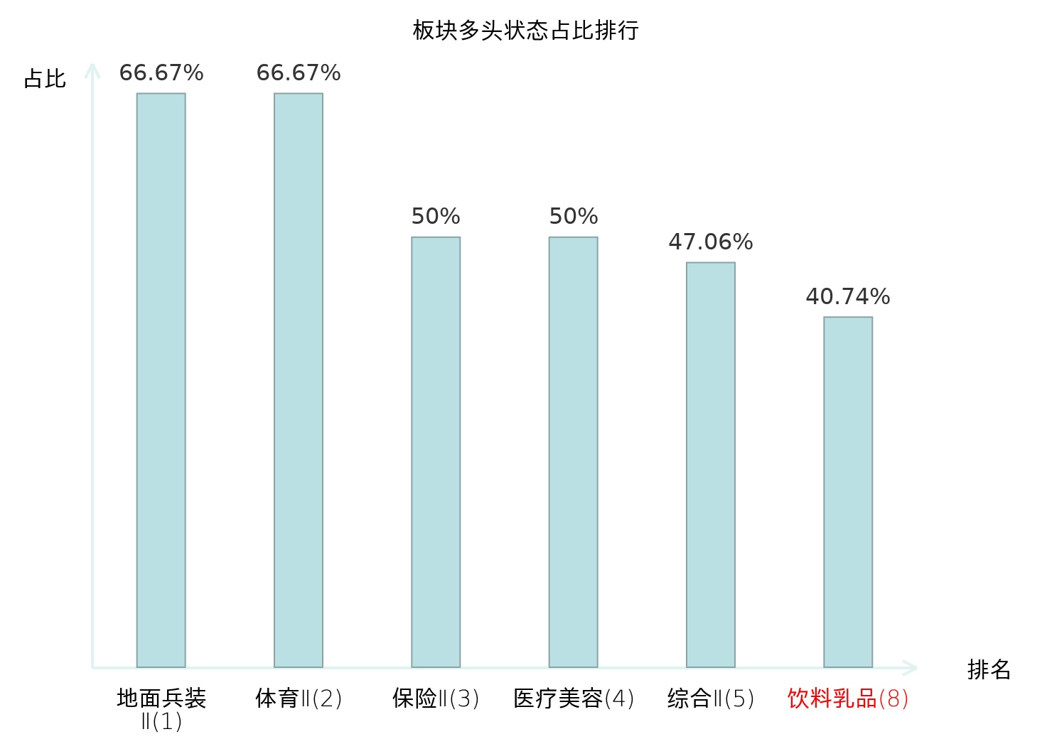 全市场所有行业板块中主力多头状态占比排名中,地面兵装Ⅱ板块位居第一。保险Ⅱ板块名次提升最快,较昨日上升82位。