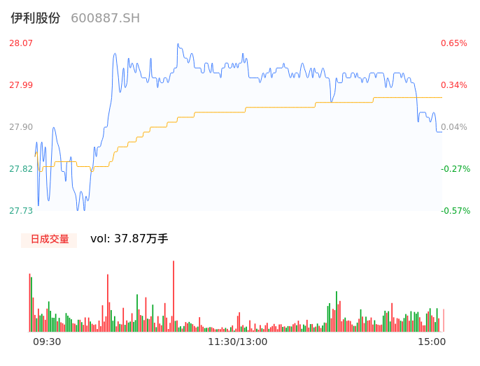 04月23日,伊利股份收报27.92,股价涨幅0.11%,成交金额10.59亿元,换手率0.60%。