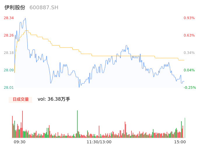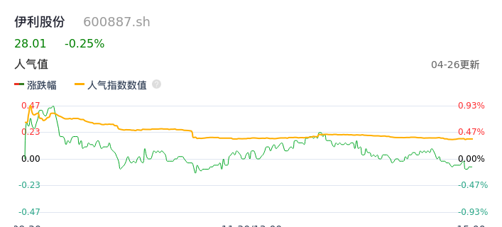 04月26日,伊利股份收报28.01,股价涨幅-0.25%,成交金额10.24亿元,换手率0.58%。