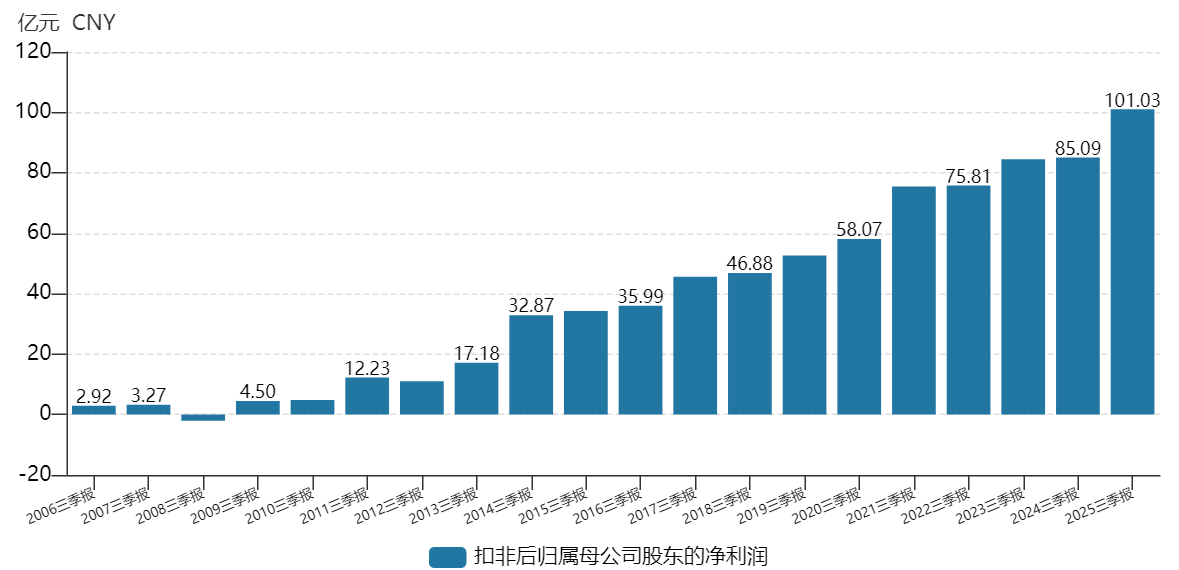 2025年前三季度,伊利实现营业总收入905.64亿元,同比增长1.71%;归母净利润为104.26亿元,同比下降4.07%;扣非归母净利润为101.03亿元,同比增长18.73%。对比历史数据看,伊利股份首次实现前三季度扣非净利润突破百亿大关,创历史新高,反映公司核心盈利能力提升,凸显主营业务的高质量发展态势。