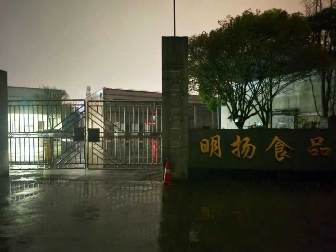 在明扬食品门口,同样停有公务部门及市场监管执法车辆,记者从厂区现场工作人员处了解到,目前市场监管执法人员正在公司内,但具体情况并不了解。透过铁门,记者可以清晰的看到有人员在厂区来回穿梭,约凌晨两点半离开时,市场监管等部门执法人员仍未离开明扬食品工厂。