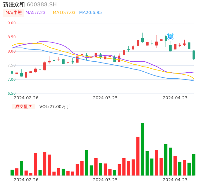04月23日,新疆众和收报7.72,股价涨幅-4.46%,成交金额2.11亿元,换手率1.98%。