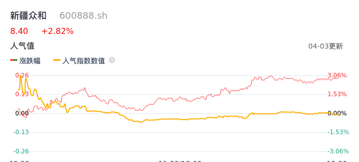 04月03日,新疆众和收报8.40,股价涨幅2.82%,成交金额3.38亿元,换手率2.98%。
