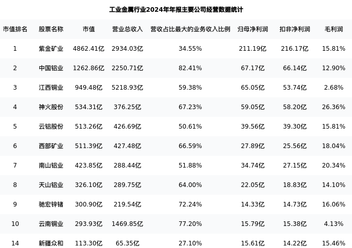 新疆众和最新报告期数据为年报,下表汇总了工业金属行业内市值靠前的公司年报主要经营数据