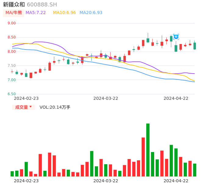 04月22日,新疆众和收报8.08,股价涨幅-2.30%,成交金额1.65亿元,换手率1.47%。