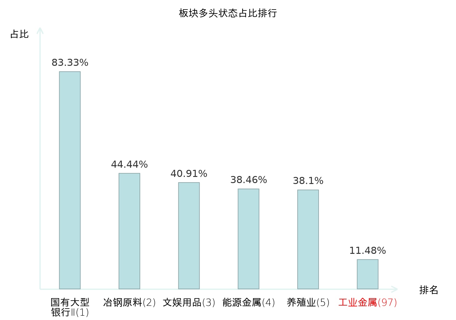 全市场所有行业板块中主力多头状态占比排名中,国有大型银行Ⅱ板块位居第一。影视院线板块名次提升最快,较昨日上升54位。