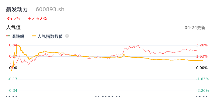 04月24日,航发动力收报35.25,股价涨幅2.62%,成交金额8.16亿元,换手率0.87%。