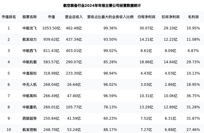 航发动力最新报告期数据为年报,下表汇总了航空装备行业内市值靠前的公司年报主要经营数据