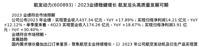 值得注意的是:2024年04月中金公司的刘中玉/陈显帆/刘婧分析师,首次发布关于航发动力的研究报告,标题为:航发动力(600893):2023业绩稳健增长 航发龙头高质量发展可期。