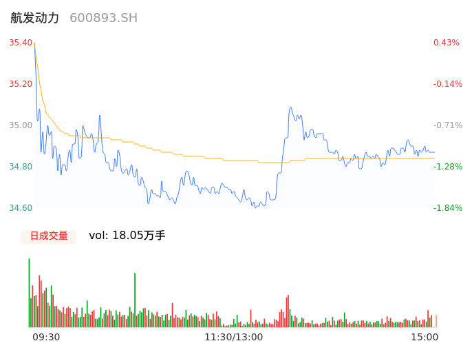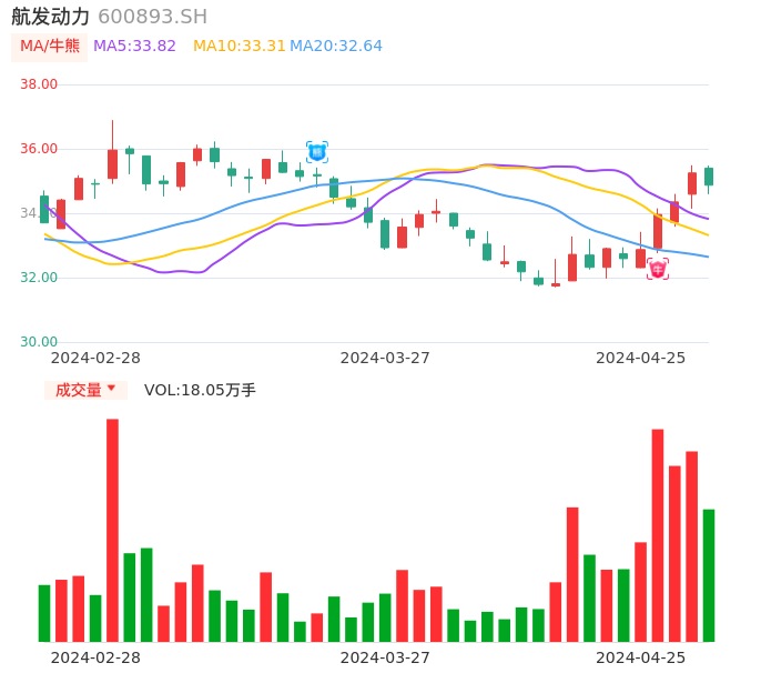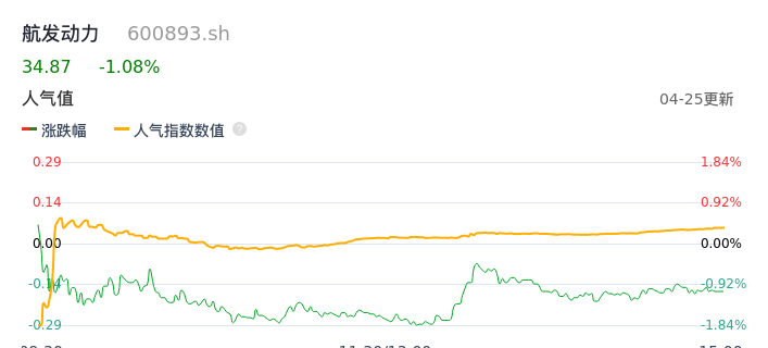 04月25日,航发动力收报34.87,股价涨幅-1.08%,成交金额6.29亿元,换手率0.68%。