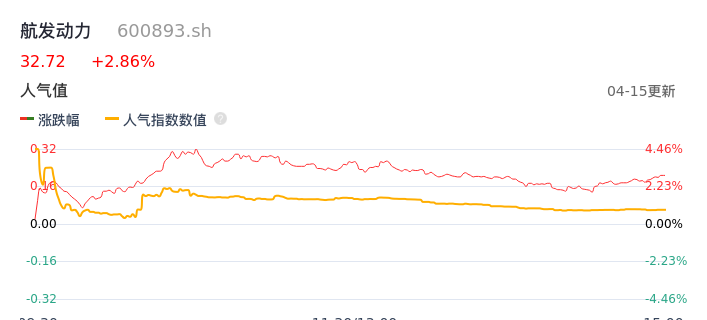 04月15日,航发动力收报32.72,股价涨幅2.86%,成交金额5.97亿元,换手率0.68%。